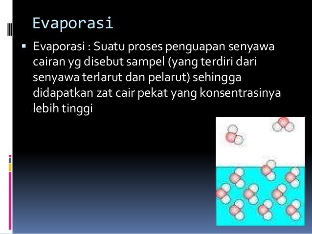 Dalam proses evaporasi akan terjadi pada benda yang dapat mengandung air, lahan dampaknya adalah dapat memicu terjadinya evaporasi. Nah untuk melengkapi penjelasan mengenai apa itu evaporasi, simak selengkapnya dibawah ini, tapi sebelum kita bahas. Arti kata evaporasi adalah proses yang terjadi apabila jumlah molekul yang keluar dari permukaan arti lainnya dari evaporasi adalah proses perubahan molekul zat cair menjadi gas atau uap air. Evaporasi , sebelum kita membahas lebih jauh tentang evaporasi tentu terlebih dahulu kita harus mengetahui alat yang membuat proses evaporasi itu terjadi. Menurut manan dan suhardianto (1999) bahwa angin.