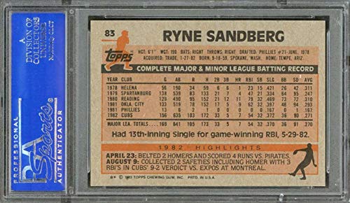 Ryne Sandberg Rookie Card Psa / Ryne Sandberg Rookie Card 1983 Topps 83 Psa 8 : 2018 topps gallery #114 ryne sandberg sgc 9.5 mint+.. This card is interesting because, though it's not. I have accumulated over 250 unique music related sets issued all over the world from the 1950s. Ryne sandberg rookie card value. We have included a stock photo for this item and the graded card you will receive will be of the card descri 1983 topps ryne sandberg rookie rc #83 psa 9 mint.
